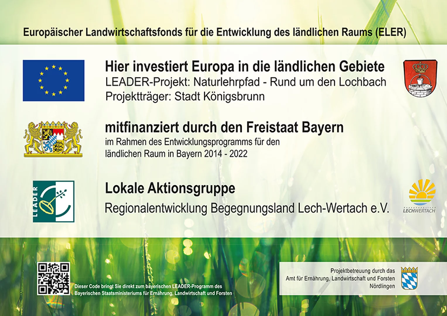 Der Naturlehrpfad am Lochbach wurde 2023 neu angelegt. Entlang des circa 2,5 km langen Weges im Naturschutzgebiet erfahren Spaziergänger und Erholungssuchende viel Wissenswertes rund um dieses wertvolle Fleckchen Natur. Teil des Projekts ist die ebenfalls neu errichtete Schaffner-Bruck. Mit ihr ermöglicht die Stadt Königsbrunn Fußgängern und Radfahrenden wieder einen Übergang über den Lochbach zum Mandichosee.
