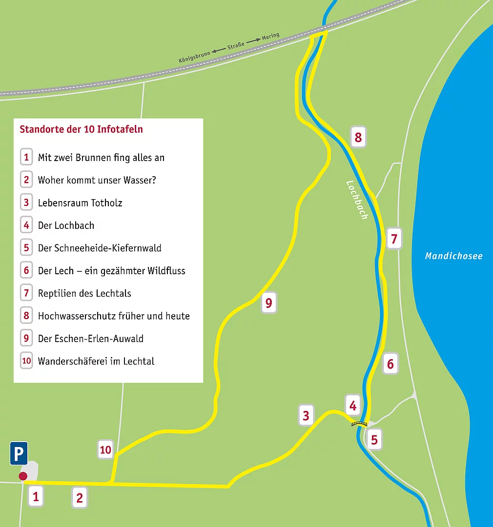 Schaffner-Bruck und Naturlehrpfad sind von der Lechstraße in Königsbrunn kommend über die Bachstraße zu erreichen. Ein Parkplatz befindet sich kurz vor dem Wald auf der linken Seite.
