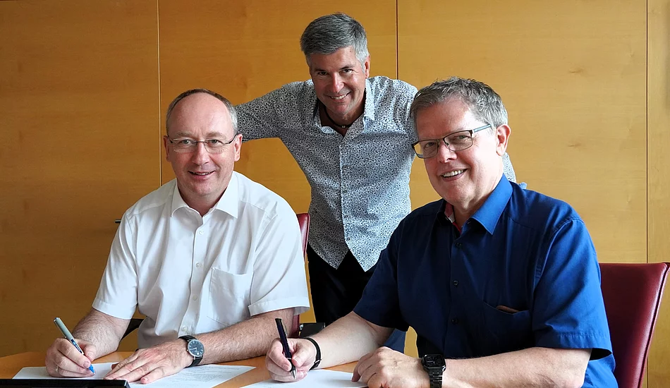 1. Bürgermeister Franz Feigl begrüßte Anfang August 2024 seinen Amtskollegen Helmut Luichtl, 1. Bürgermeister aus Merching, im Königsbrunner Rathaus. Anlass war die Vertragsunterzeichnung einer Zweckvereinbarung zwischen der Königsbrunner IT und dem Mittelschulverband Merching. Neben der Grund- und Mittelschule in Merching werden ab 1. September 2024 auch die drei Bobinger Grundschulen und die Mittelschule unserer Nachbarkommune von unserer Abteilung für Informations- und Kommunikationstechnik (IuK) betreut. Insgesamt neun Grundschulen und drei Mittelschulen aus verschiedenen Gemeinden profitieren dann ab dem Schuljahr 2024/2025 von dem gebündelten IT-Know-how aus Königsbrunn.