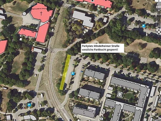 Im Zuge der Bauarbeiten muss am Parkplatzende der Mindelheimer Straße die westliche Parkbucht vom 28.07.2025 bis Anfang September 2025 gesperrt werden. Wir bitten alle Halterinnen und Halter der dort abgestellten Fahrzeuge, diese rechtzeitig zu entfernen, um Behinderungen der Arbeiten und das Abschleppen der Fahrzeuge zu vermeiden. Die Fahrgasse sowie die übrigen Parkbuchten sind nicht betroffen.