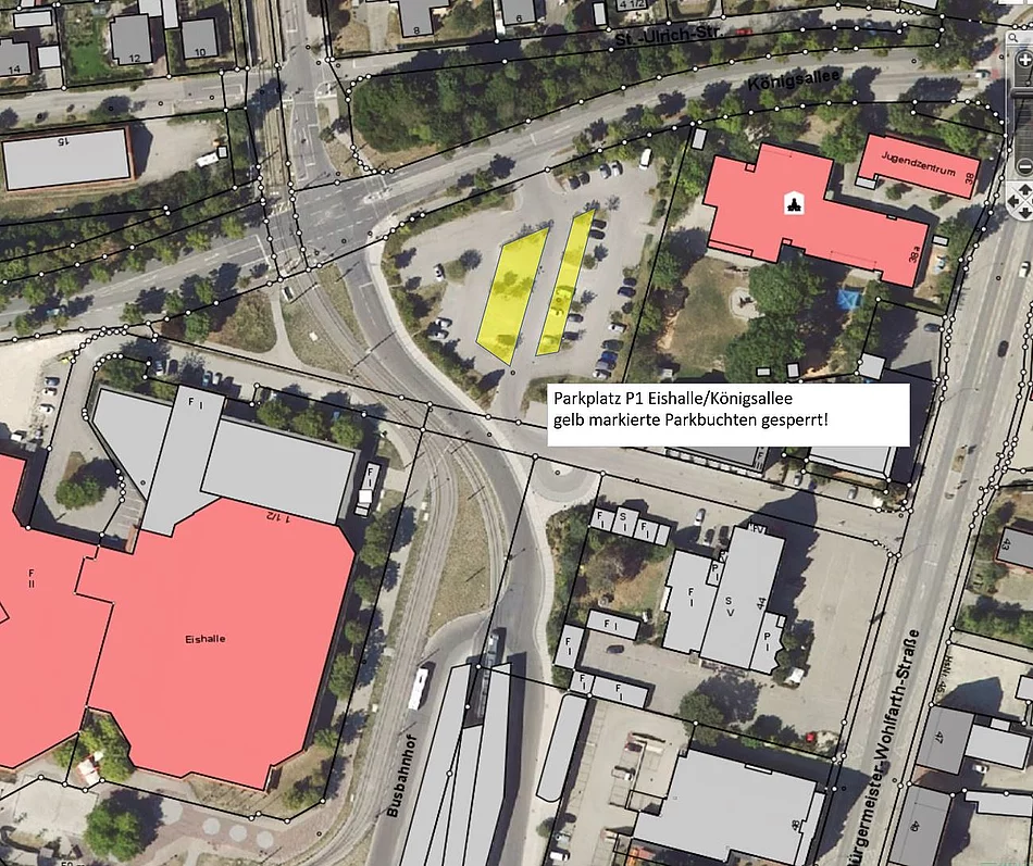 Auch am Parkplatz P1 Eishalle/Königsallee werden Ersatzhaltestellen eingerichtet. Hierzu müssen mehrere Parkbuchten gesperrt werden.