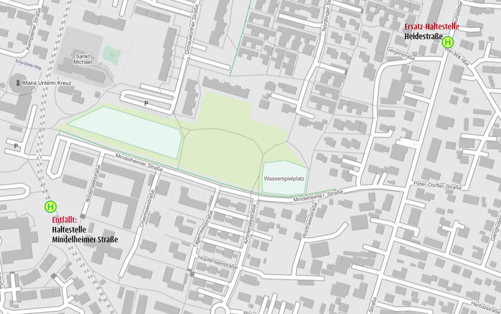 Die Haltestelle "Mindelheimer Straße" kann nicht bedient werden. Zusätzlich angefahren und in beide Richtungen mitbedient wird jedoch die AVV-Haltestelle "Heidestraße". Diese befindet sich nicht in der Heidestraße selbst, sondern auf der Bürgermeister-Wohlfarth-Straße – ungefähr auf Höhe der Einmündung in die Heidestraße.