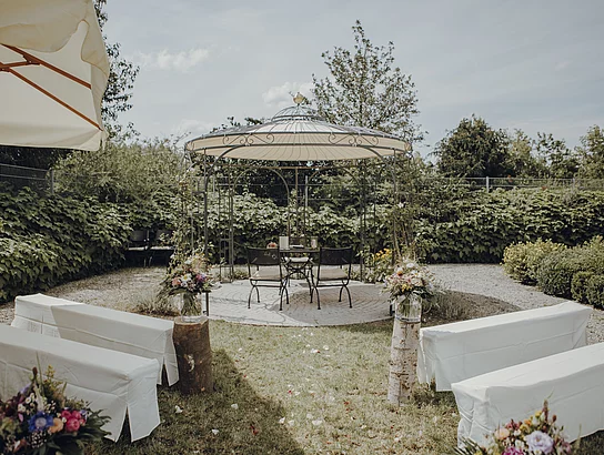 Am Freitag, 18. Juli, und Samstag, 19. Juli 2025, geben sich Brautpaare im mit Blumen wunderschön geschmückten Trauungspavillon ganz romantisch das Ja-Wort. Deshalb ist die Gartenanlage rund um das Mercateum für nicht geladene Gäste gesperrt.