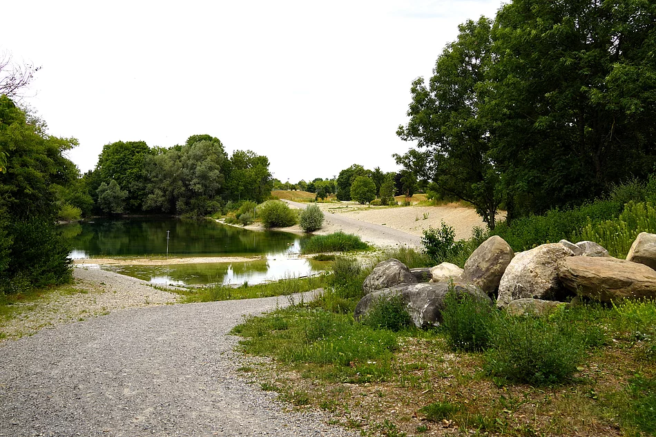 Am nördlichen Uferbereich soll das "Alpinum" entstehen, ein naturnaher Böschungsbereich mit heimischer Bepflanzung, der hochwertige Lebensräume für Insekten und Amphibien bereitstellt und über unbefestigte Pfade zum Verweilen und Erkunden einlädt.