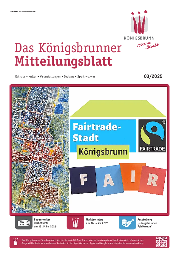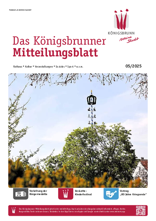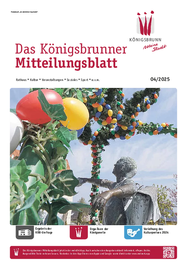 Das monatlich erscheinende Mitteilungsblatt der Stadt Königsbrunn informiert über wichtige Aktivitäten und Vorhaben in Königsbrunn. Es ist kostenlos und wird an alle Königsbrunner Haushalte per Post verteilt. Darüber hinaus liegt es in einigen städtischen Einrichtungen zum Mitnehmen aus.