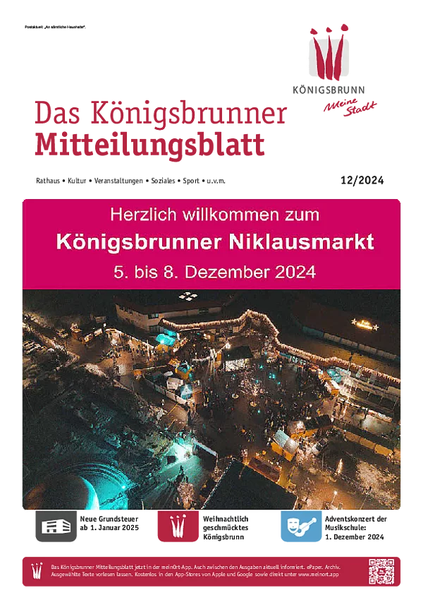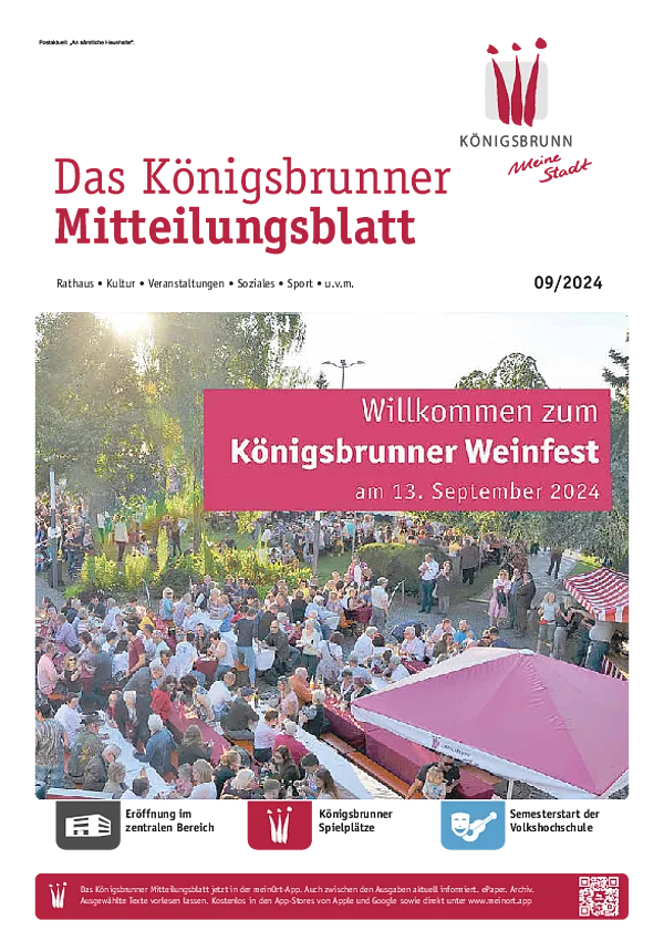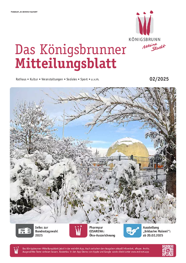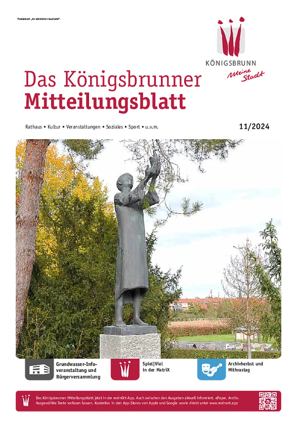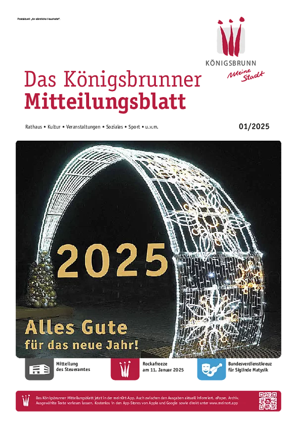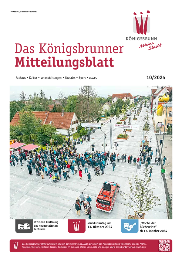 Das monatlich erscheinende Mitteilungsblatt der Stadt Königsbrunn informiert über wichtige Aktivitäten und Vorhaben in Königsbrunn. Es ist kostenlos und wird an alle Königsbrunner Haushalte per Post verteilt. Darüber hinaus liegt es in einigen städtischen Einrichtungen zum Mitnehmen aus.